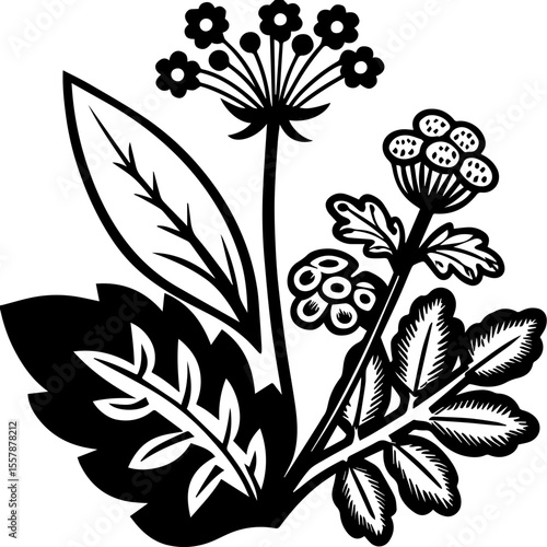 Decorative flower art with foliage, natural leaves, and herbs, SVG with clean lines. Floral Design with Leaves and Flowers in Monochrome Style