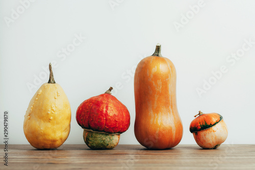 Decorative pumpkins on yellow background. Minimal helloween trendy concept.