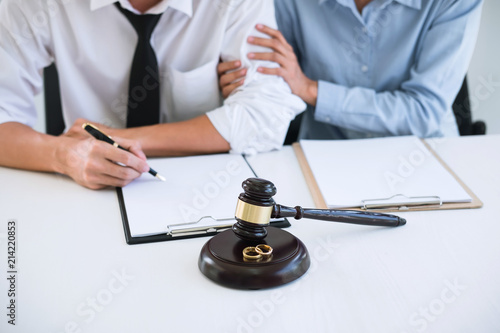 Decree of divorce (dissolution or cancellation) of marriage, husband and wife during divorce process with lawyer or counselor and signing of divorce contract