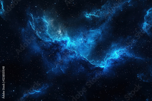 Deep blue interstellar cloud with wisps of illuminated gaseous formations.
