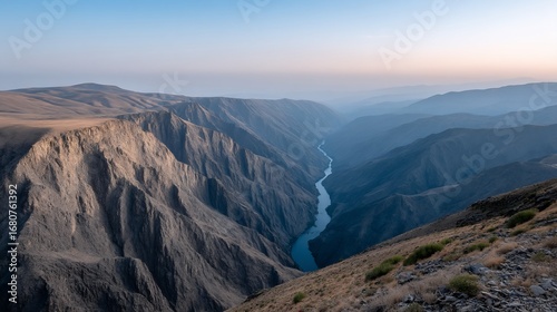 Deep canyon view; steep cliffs meet a blue river under a hazy sky