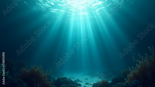 Deep ocean background with light rays penetrating water