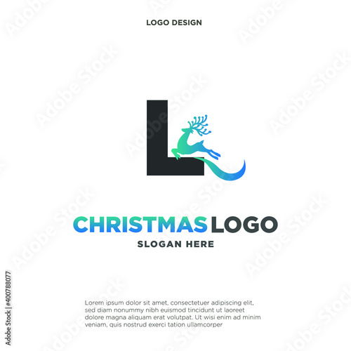 Deer Logo. Blue Shape Initial Letter L with Negative Space Jumping Deer Silhouette inside isolated on Grey Background. Flat Vector Logo Design Template Element.