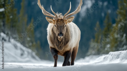 Deer with large antlers is walking through the snow. Concept of strength and power, as the deer's antlers are prominently displayed. The snowy landscape adds a sense of tranquility