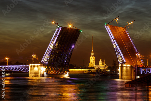 Defocused city landscape of raised Palace bridge above river Neva. White night in Saint-Petersburg, Russia.
