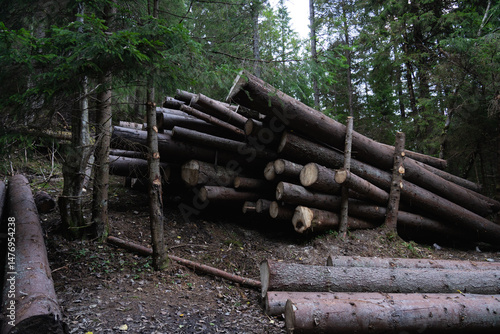 Deforestation. Stacked logs ready for transport in a forest setting during daylight hours. Hiking in Carpathian Mountains, Ukraine