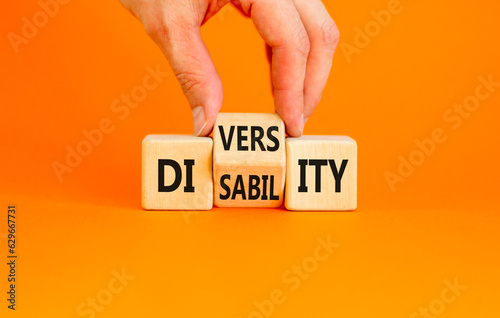 DEI Diversity or disability symbol. Concept words Diversity disability on wooden block. Beautiful orange table orange background. Businessman hand. Business diversity disability concept.