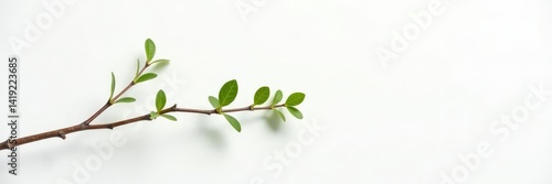 Delicate branch with tiny leaves on a plain white background, twig, small leaves