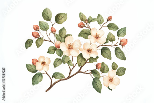 Delicate floral arrangement featuring soft pink buds and creamy white blossoms on a graceful branch with lush green leaves