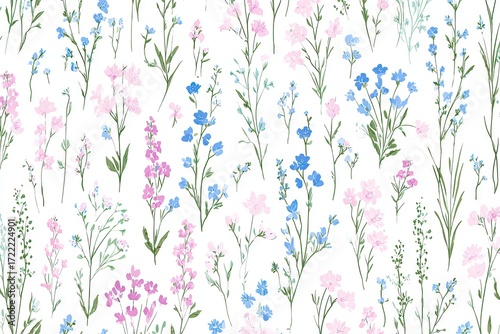 Delicate floral pattern with various shades of pink and blue wildflowers.