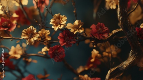 Delicate Flowering Tree Branches with Red and Yellow Blooms Against a Dark Blue Background