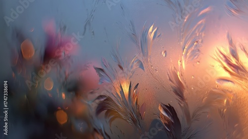 Delicate frost patterns adorn a window, catching the light of the sunrise. Use it for backgrounds or to illustrate cold weather concepts.