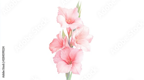 Delicate gladiolus flowers bloom in soft pink and red, showcasing elegance in a serene watercolor botanical illustration