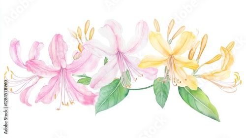 Delicate honeysuckle blooms in soft pink and yellow create a serene watercolor botanical masterpiece