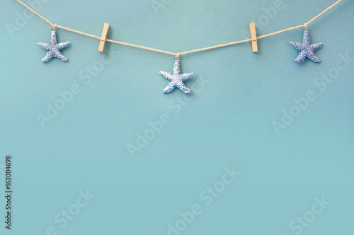 Delicate nautical border with starfish on a background of colourful turquoise blue painted boards with copyspace for your text