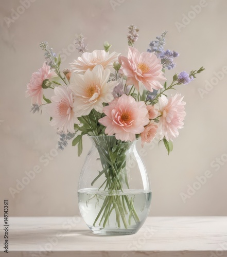 Delicate pastel watercolor flowers in a glass vase, soft hues , calm, design, delicate