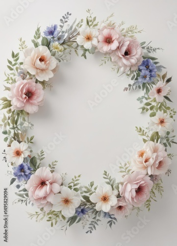 Delicate petal watercolor wreath; white background, floral pattern, invitation, beauty, spring
