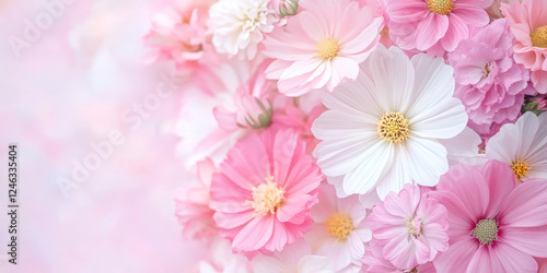 Delicate pink and white flowers in soft focus romantic floral composition with gentle pastel tones
