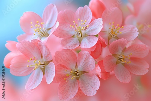 Delicate pink blossoms clustered together, soft focus, and a light blue background