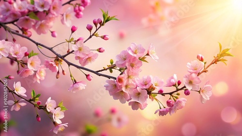 Delicate pink blossoms gracefully adorn a branch, bathed in the warm glow of a setting sun, creating a breathtaking springtime scene of serene natural beauty.