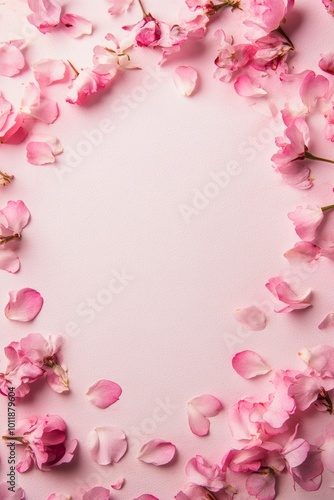 Delicate pink cherry blossom petals scattered on a soft pink background.