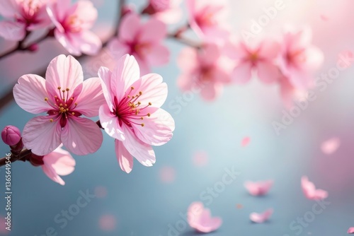 Delicate pink cherry blossoms, scattered petals on soft background, sakura background, delicate