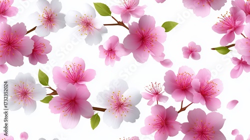 Delicate Pink Cherry Blossoms with White Accents and Green Leaves on White Background