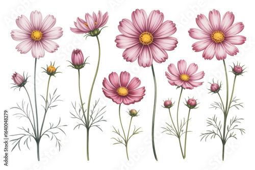 Delicate pink cosmos flowers with green stems and leaves isolated on transparent background