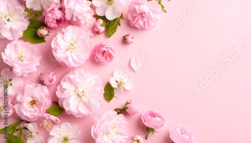 Delicate pink flowers arranged on a pastel pink background