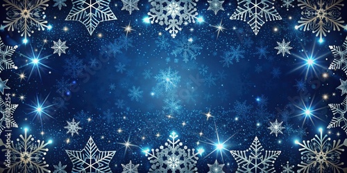 Delicate snowflake-patterned border on a dark blue background with twinkling stars in a night sky setting, galaxy