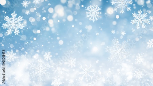 Delicate snowflakes float against a serene blue winter backdrop.