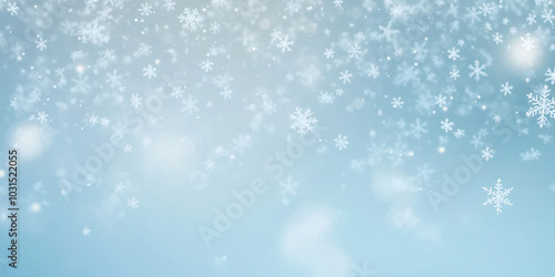 Delicate snowflakes gently falling against a soft blue gradient background, evoking the peaceful beauty and serenity of winter
