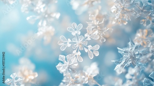 Delicate snowflake-shaped paper flakes in frosty white and blue tones, hanging sparsely on an icy light blue background