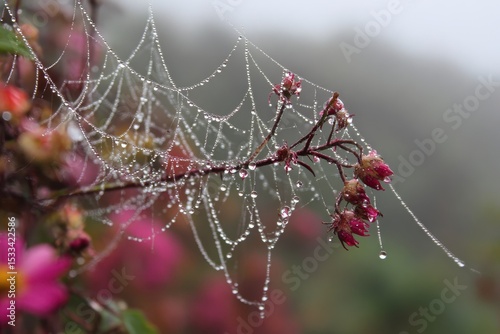 Delicate Spider Web with Dew Drops on Flowers in Soft Morning Light