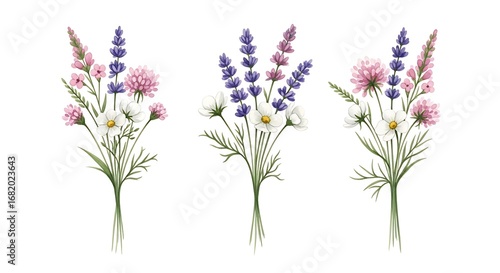 Delicate Watercolor Bouquets of Wildflowers Featuring Lavender Daisies and Clover for Natural Beauty and Serenity