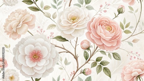 Delicate watercolor floral arrangement with a seamless pattern of roses and blooms in soft pink hues.
