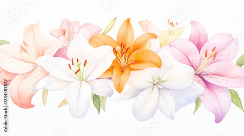 Delicate watercolor illustration of lilies showcasing white, orange, and pink hues in a botanical composition