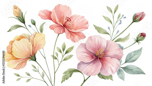 Delicate watercolor illustration of pink and yellow hibiscus flowers with green leaves, showcasing natural and elegant floral arrangement