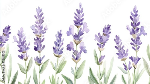 delicate watercolor lavender flowers forming seamless border soft purple hues blending with green stems ethereal botanical illustration on pristine white background