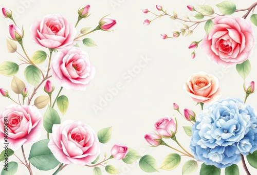 Delicate watercolor roses, hydrangeas, buds, leaves & branches; botanical garden collection , isolated, greenery