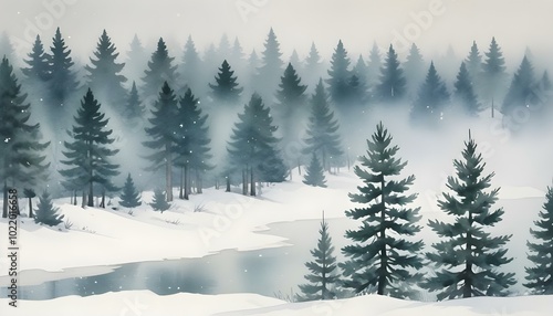 Delicate Watercolor Winter Landscapes Featuring Blurred Snowflakes and Pine Trees
