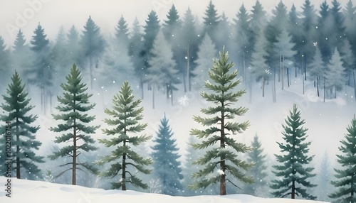 Delicate Watercolor Winter Landscapes Featuring Blurred Snowflakes and Pine Trees