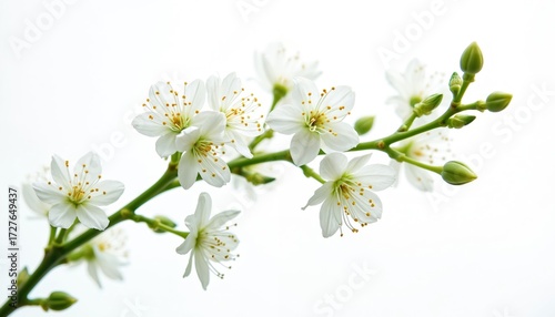 Delicate white blossom branch with tiny green buds opens on clean white background. Spring flora detail with fresh petals and golden stamens signifies new life and renewal.