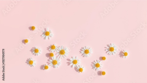Delicate white daisies scattered on a soft pink background, a minimalist floral arrangement with natural light casting gentle shadows