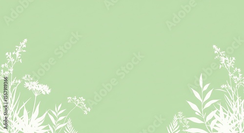 Delicate white floral silhouettes adorn the bottom corners of a soft, light green background, creating a gentle, botanical-inspired design.
