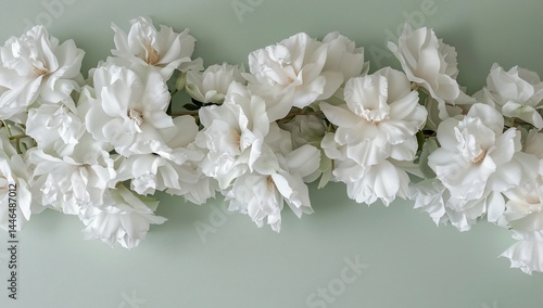 Delicate white flowers arranged in a horizontal line on a mint-green background