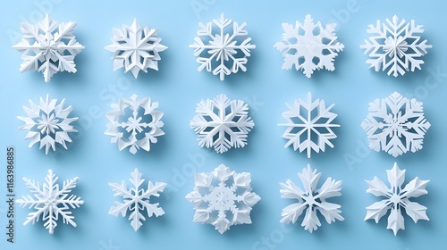 Delicate white paper snowflakes with intricate cutout details arranged in neat rows against a light baby blue background, showcasing minimalist winter decoration with soft drop shadows.