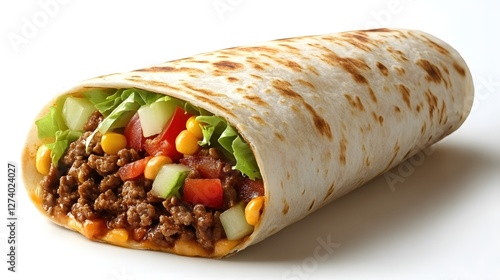 Delicious and Fresh Burrito Filled with Ground Beef Lettuce Tomatoes and Corn on White Surface