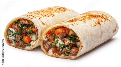 Delicious beef burritos with fresh ingredients, isolated on white background.
