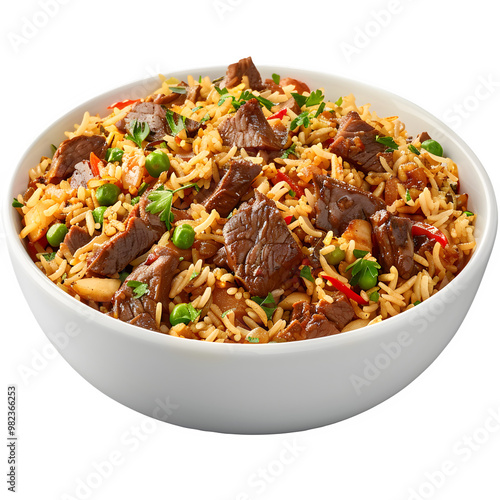 Delicious bowl of beef fried rice mixed with colorful veggies and herbs, set against a clear background for versatile design purposes
